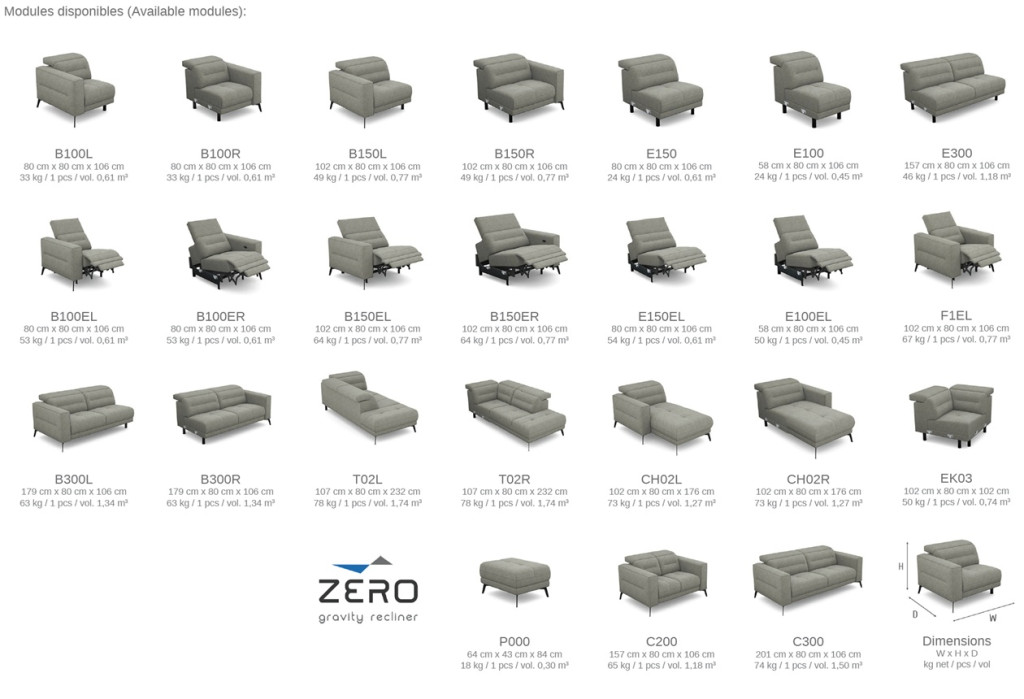 A reclinerek (lábtartós relax fotelek illetve kanapék) kézi és elektromos kivitelben is kaphatók, illetve kanapéba és sarok ülőgarnitúrákhoz is rendelhetőek.