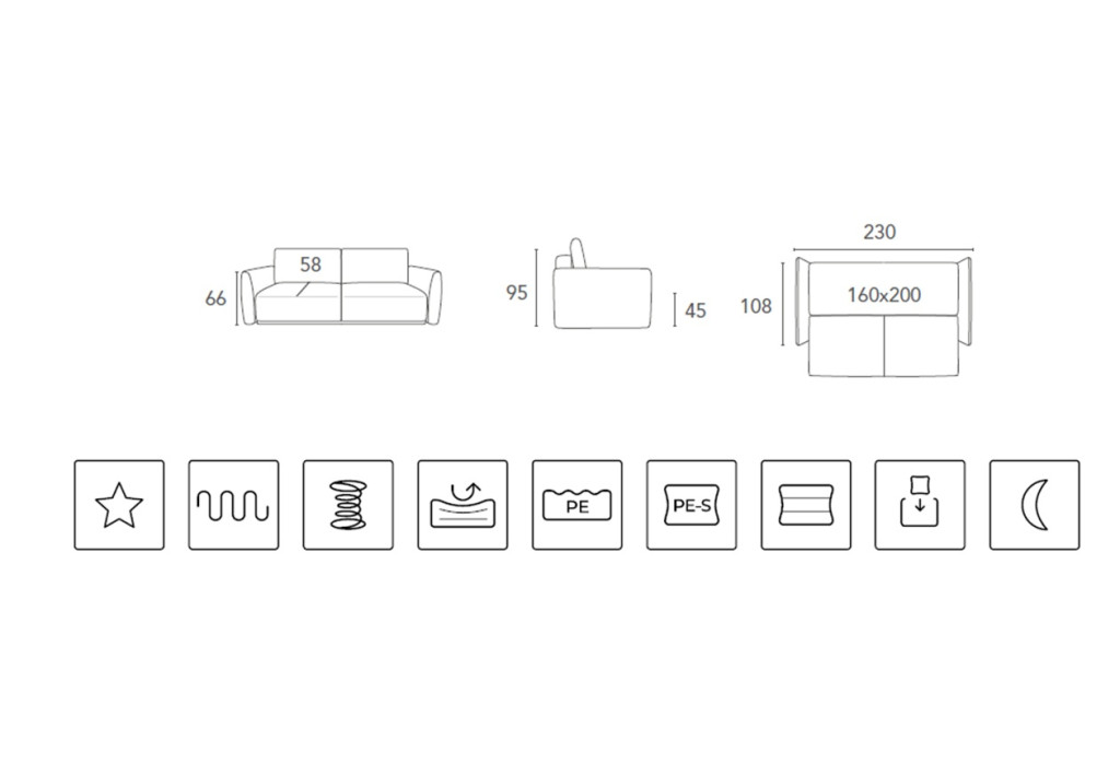 Ez a modell "alvásfunkcióval" rendelkezik. Ez azt jelenti, hogy a fenti dedikált mechanizmus segítségével egy felületet hozhat létre a mindennapi alváshoz. Fontos: a teljes felület hasonló rugalmassággal rendelkezik (hatás: félig rugalmas és félkemény). Fekvőfelület: 160 cm X 200 cm