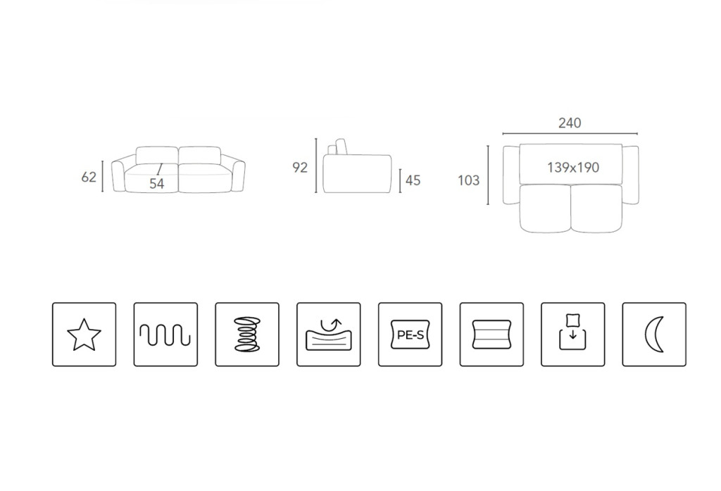 Ez a modell "alvásfunkcióval" rendelkezik. Ez azt jelenti, hogy a fenti dedikált mechanizmus segítségével egy felületet hozhat létre a mindennapi alváshoz. Fontos: a teljes felület hasonló rugalmassággal rendelkezik (hatás: félig rugalmas és félkemény). Fekvőfelület: 139 cm X 198 cm