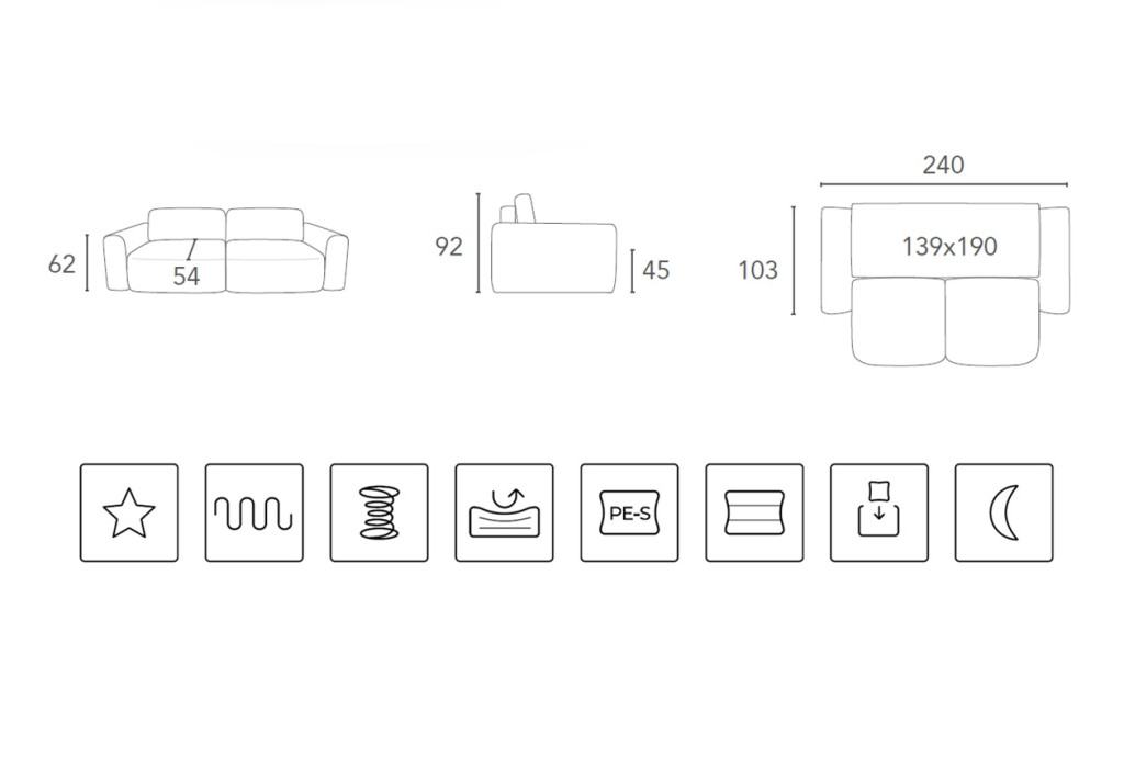 Ez a modell "alvásfunkcióval" rendelkezik. Ez azt jelenti, hogy a fenti dedikált mechanizmus segítségével egy felületet hozhat létre a mindennapi alváshoz. Fontos: a teljes felület hasonló rugalmassággal rendelkezik (hatás: félig rugalmas és félkemény). Fekvőfelület: 139 cm X 198 cm