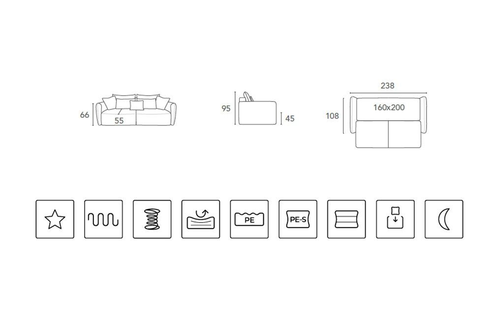 Ez a modell "alvásfunkcióval" rendelkezik. Ez azt jelenti, hogy a fenti dedikált mechanizmus segítségével egy felületet hozhat létre a mindennapi alváshoz. Fontos: a teljes felület hasonló rugalmassággal rendelkezik (hatás: félig rugalmas és félkemény). Fekvőfelület: 160 cm X 200 cm