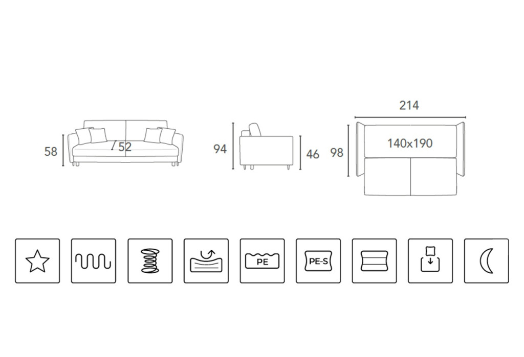 Ez a modell "alvásfunkcióval" rendelkezik. Ez azt jelenti, hogy a fenti dedikált mechanizmus segítségével egy felületet hozhat létre a mindennapi alváshoz. Fontos: a teljes felület hasonló rugalmassággal rendelkezik (hatás: félig rugalmas és félkemény). Fekvőfelület: 140 cm X 190 cm