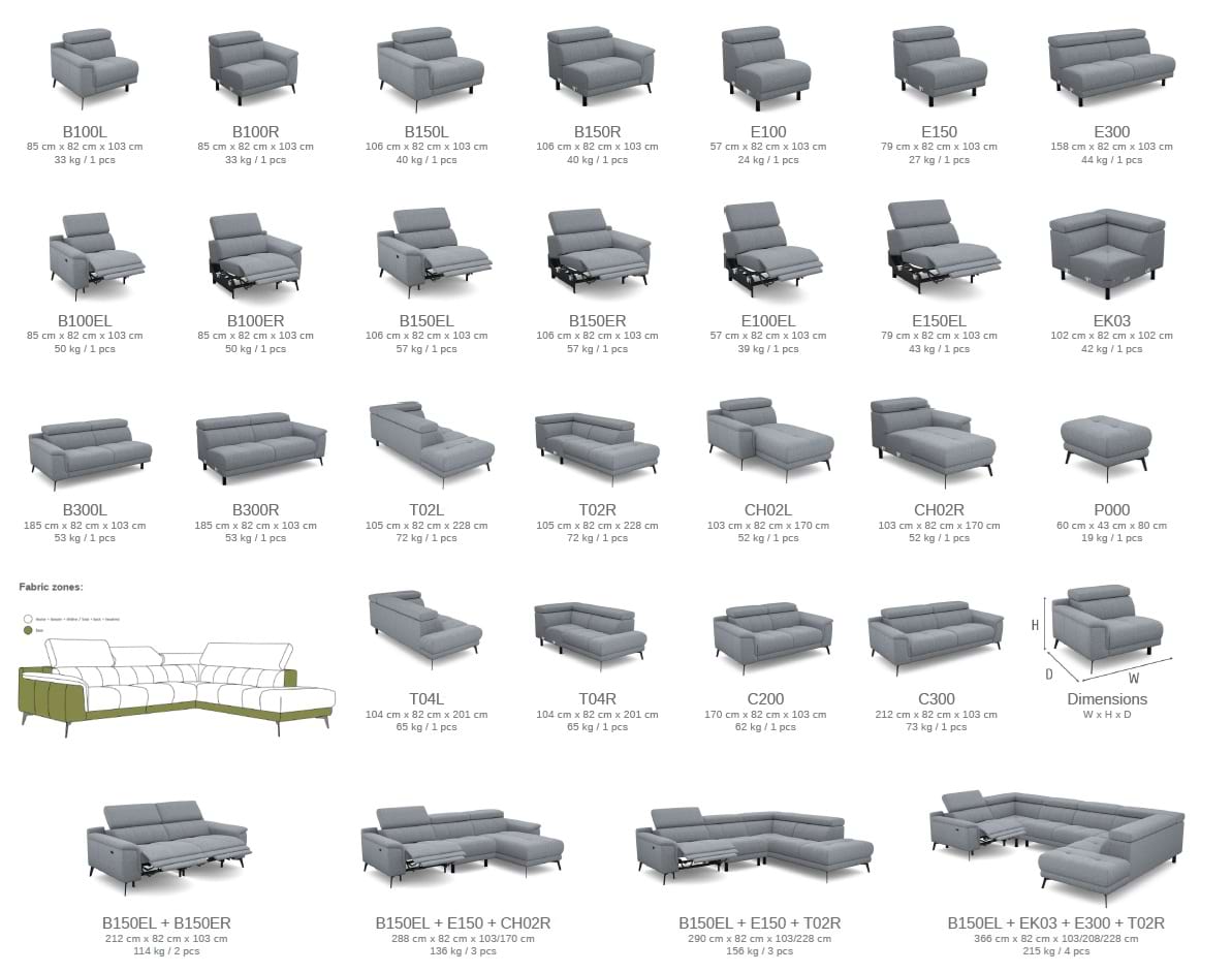 A reclinerek (lábtartós relax fotelek illetve kanapék) kézi és elektromos kivitelben is kaphatók, illetve kanapéba és sarok ülőgarnitúrákhoz is rendelhetőek.
