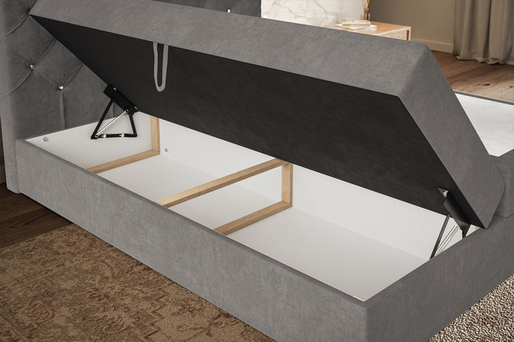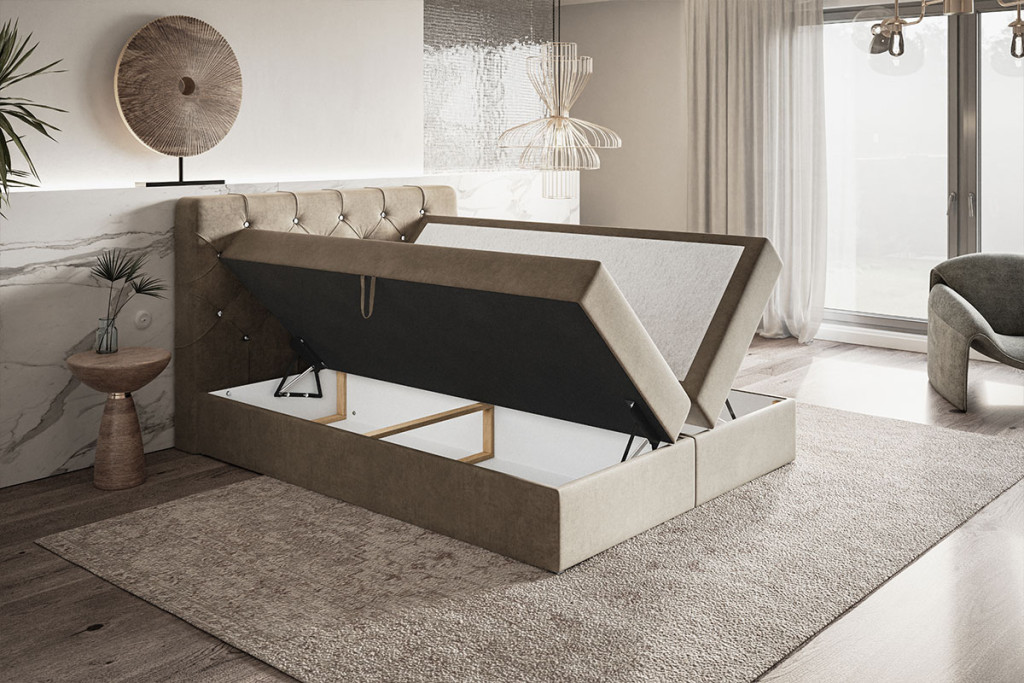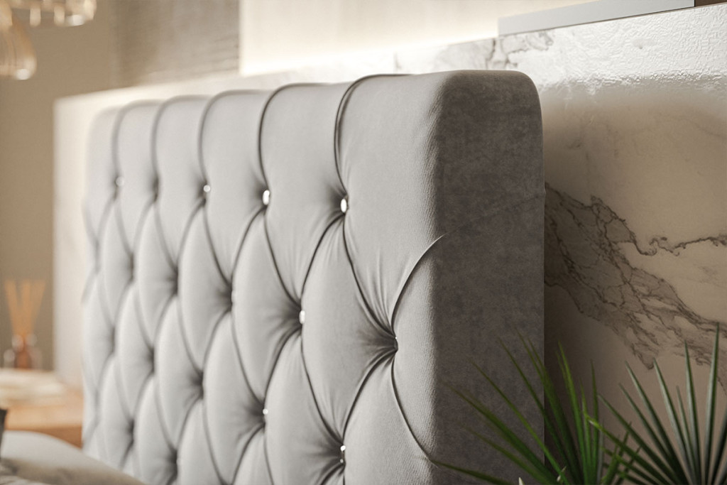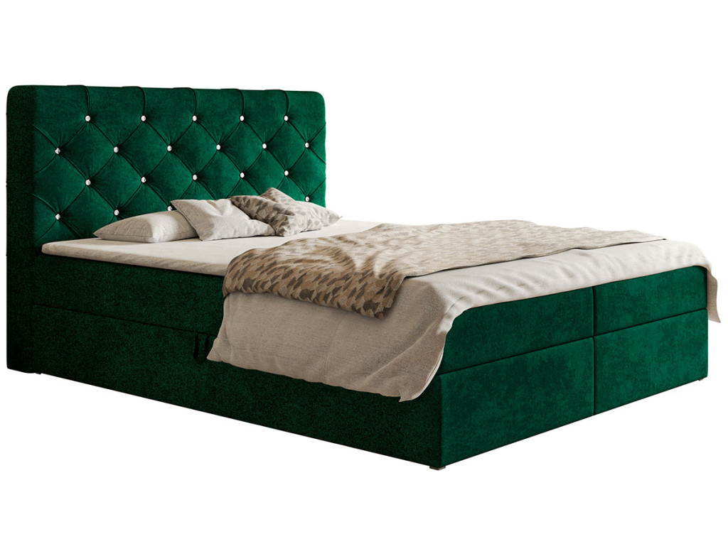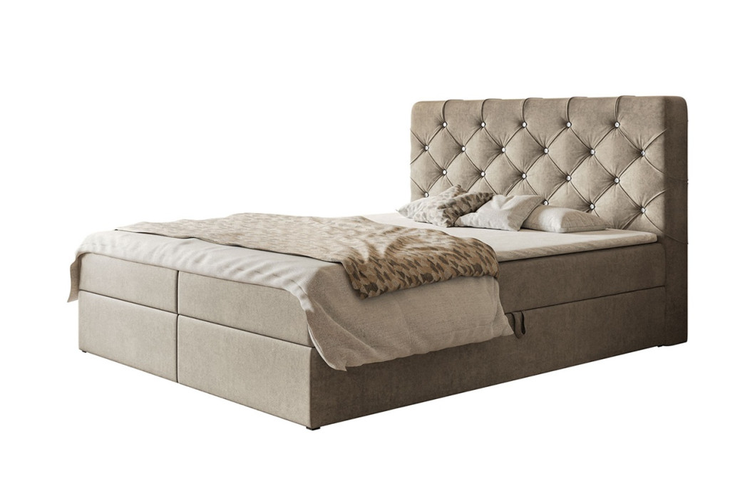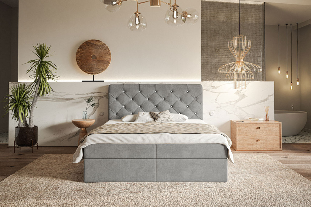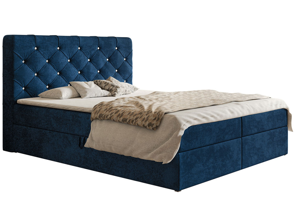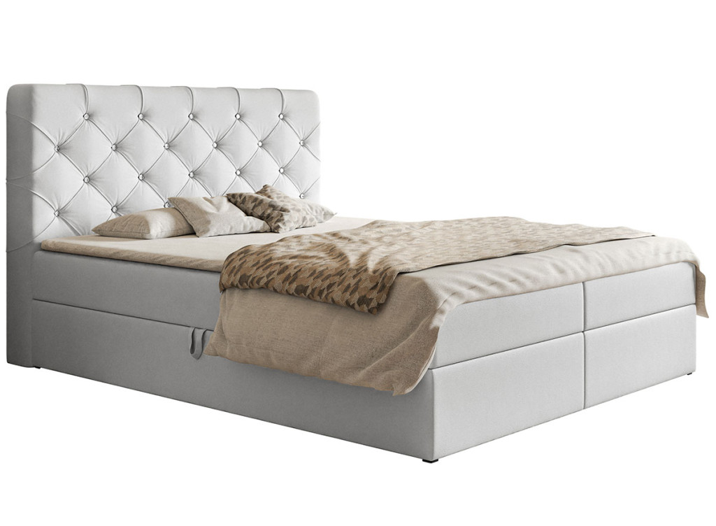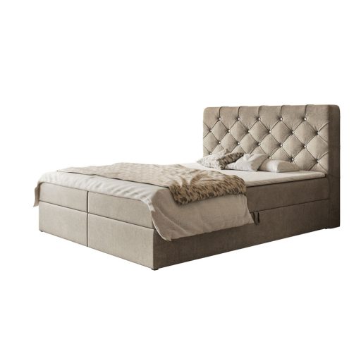 Az Nagykanizsa prémium box ágy vastag kéderrel varrott rombuszmintás és kristállyal díszített fejtámlával rendelkezik. A fejvég - ágyneműtartó - matrac - opcionális topper kombináció univerzális jellegének köszönhetően szinte minden hálószobában megjelenhet.