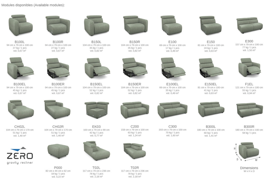 A reclinerek (lábtartós relax fotelek illetve kanapék) kézi és elektromos kivitelben is kaphatók, illetve kanapéba és sarok ülőgarnitúrákhoz is rendelhetőek.