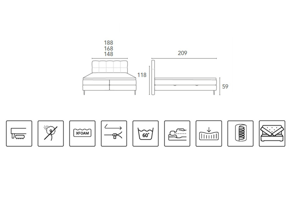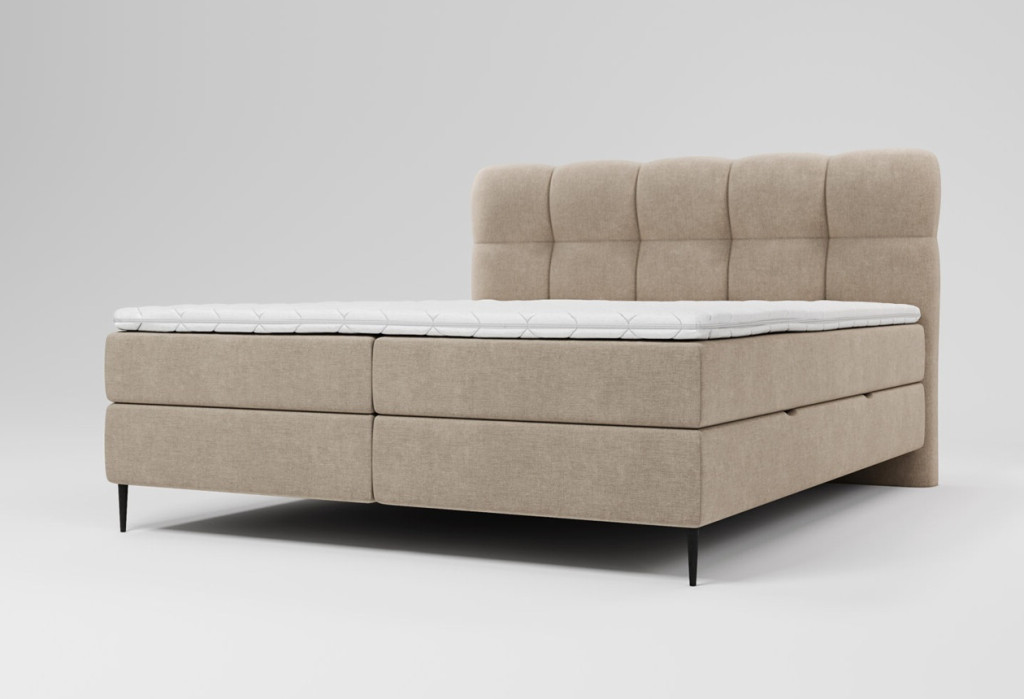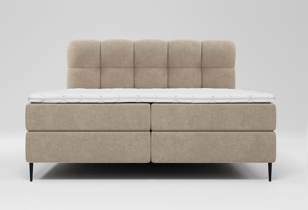A karcsú, fekete, magas lábak légies megjelenést biztosítanak, miközben modern karaktert adnak a bútornak, és megkönnyítik a takarítást az ágy alatt. A gondosan kialakított rugós szerkezet és a kényelmes fedőmatrac optimális alátámasztást nyújt, így minden éjszaka pihentető alvást biztosít.