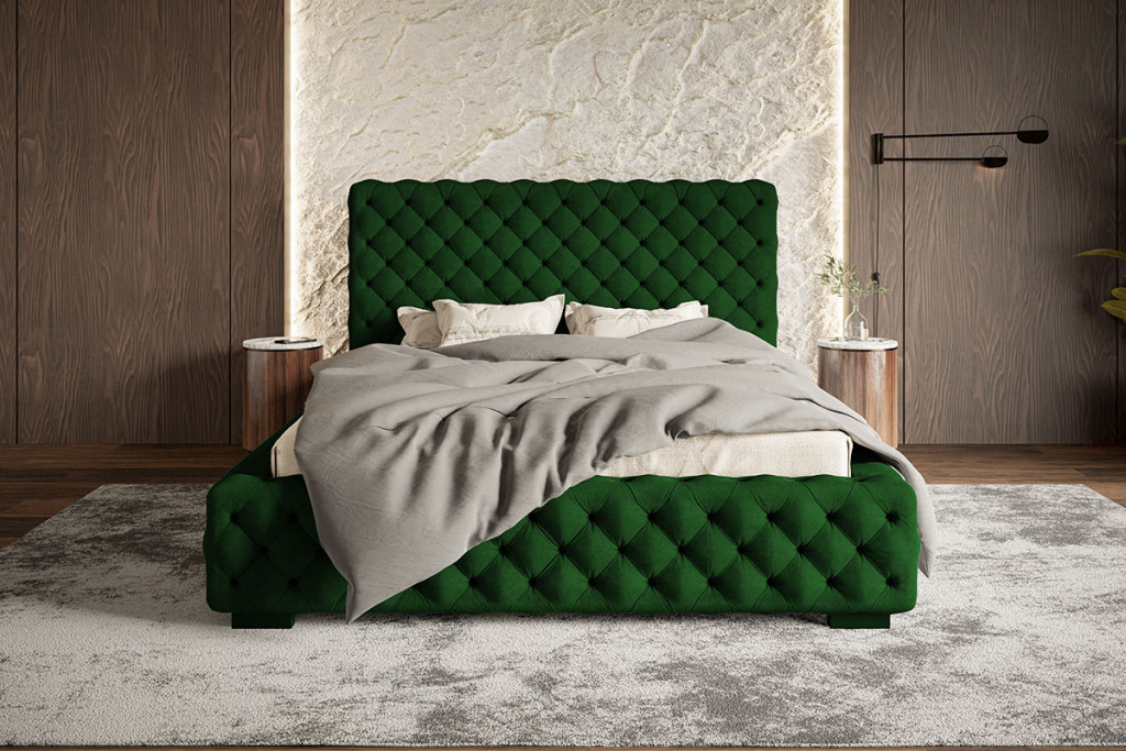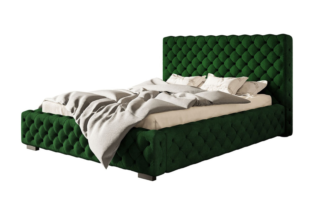 A Szeged prémium minőségű kárpitozott ágy teljes egészében (fejtámla, ágykeret oldala és lábvége) klasszikus Chesterfield-stílusú tűzéssel készült. Kronos19 huzattal, sötétzöld színben expessz szállítás keretén belül 1-14 munkanapon belül kiszállítjuk.Fejtámlája magas, vastagon párnázott, és a jellegzetes, mély gombozású rombuszmintát mutatja, ami az elegancia és a klasszikus luxus időtlen szimbóluma. Az ágykeret oldalai és lábvége is tükrözik a fejtámla tűzését, ami egy teljesen egységes, "burkolt" megjelenést kölcsönöz az ágynak. Rendelhető vízlepergető, kisállatbarát és vízzel könnyen tisztítható EasyClean huzatokkal, 1000 féle színnel. Az ágy praktikus ágyneműtartóval rendelkezik, amely extra tárolóhelyet biztosít. Ön választhatja ki, hogy fa-, vagy fémkeretes előről nyíló ágyrácsot szeretne, illeve választható 4 cm vagy 13 cm magas lábbal is.