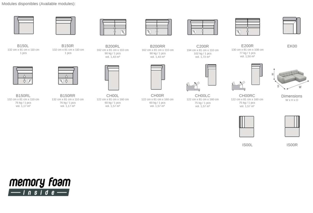 Egy kanapé összeállítása történhet: B150RL + B150RR, mely 264 cm széles.